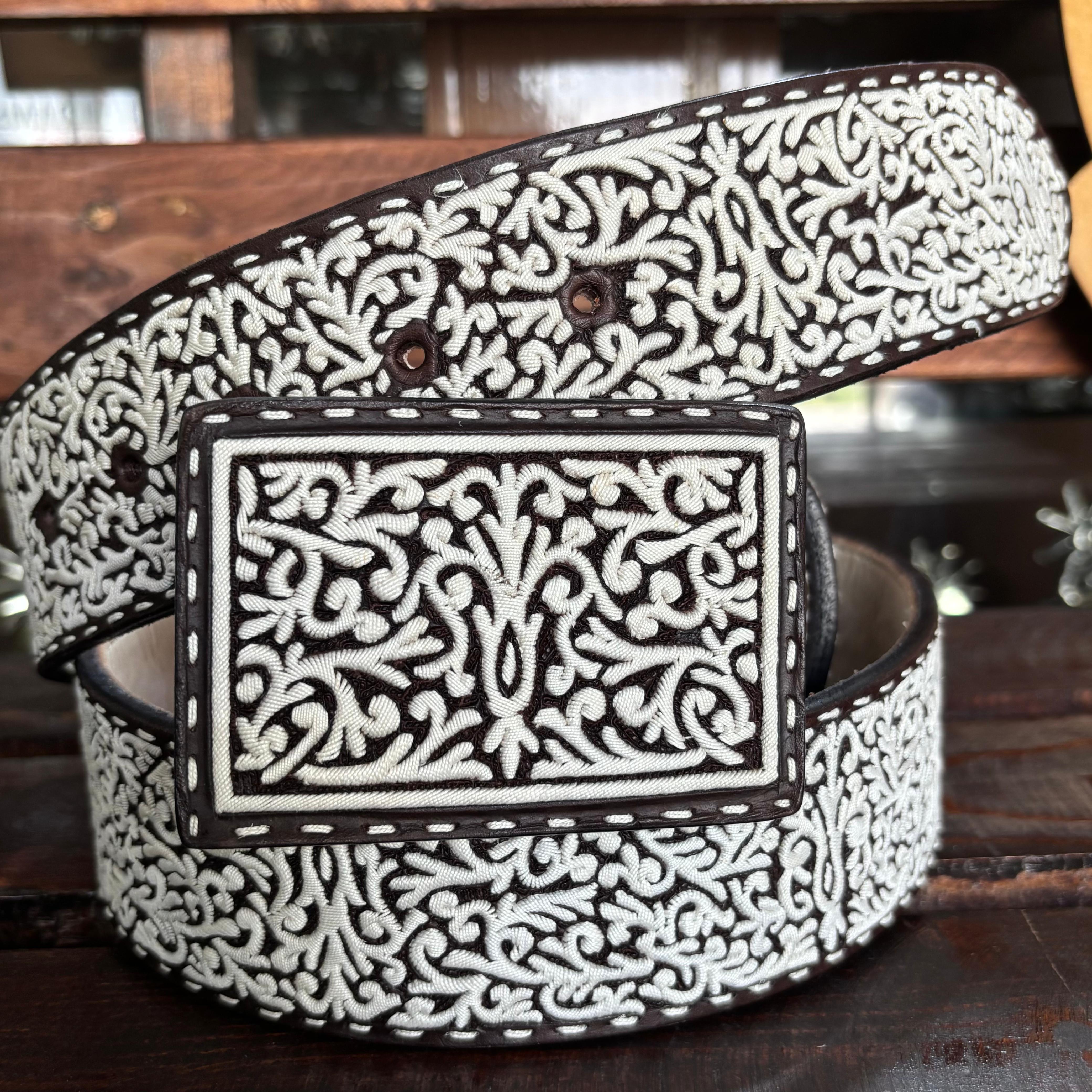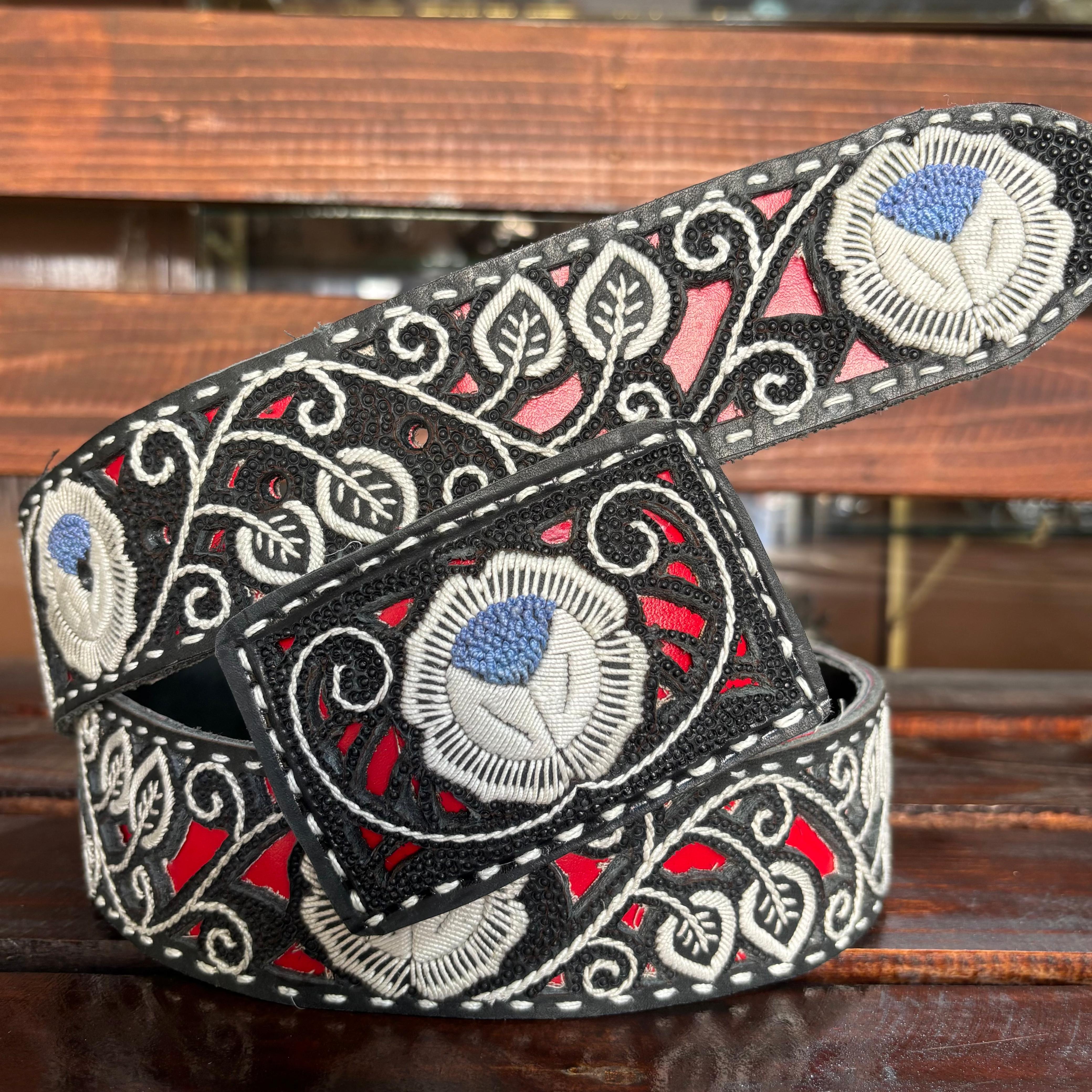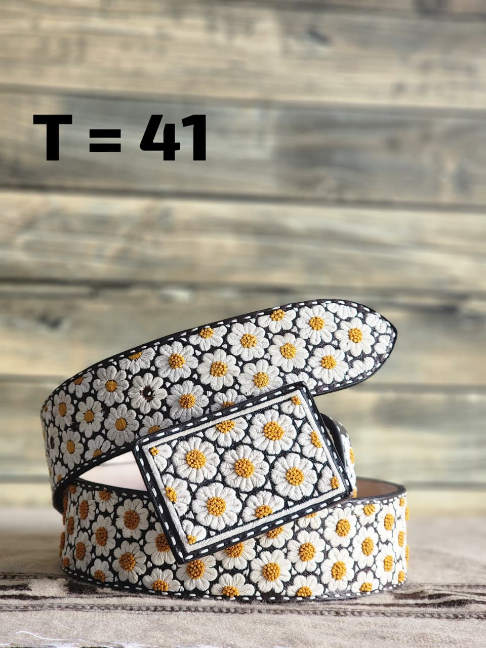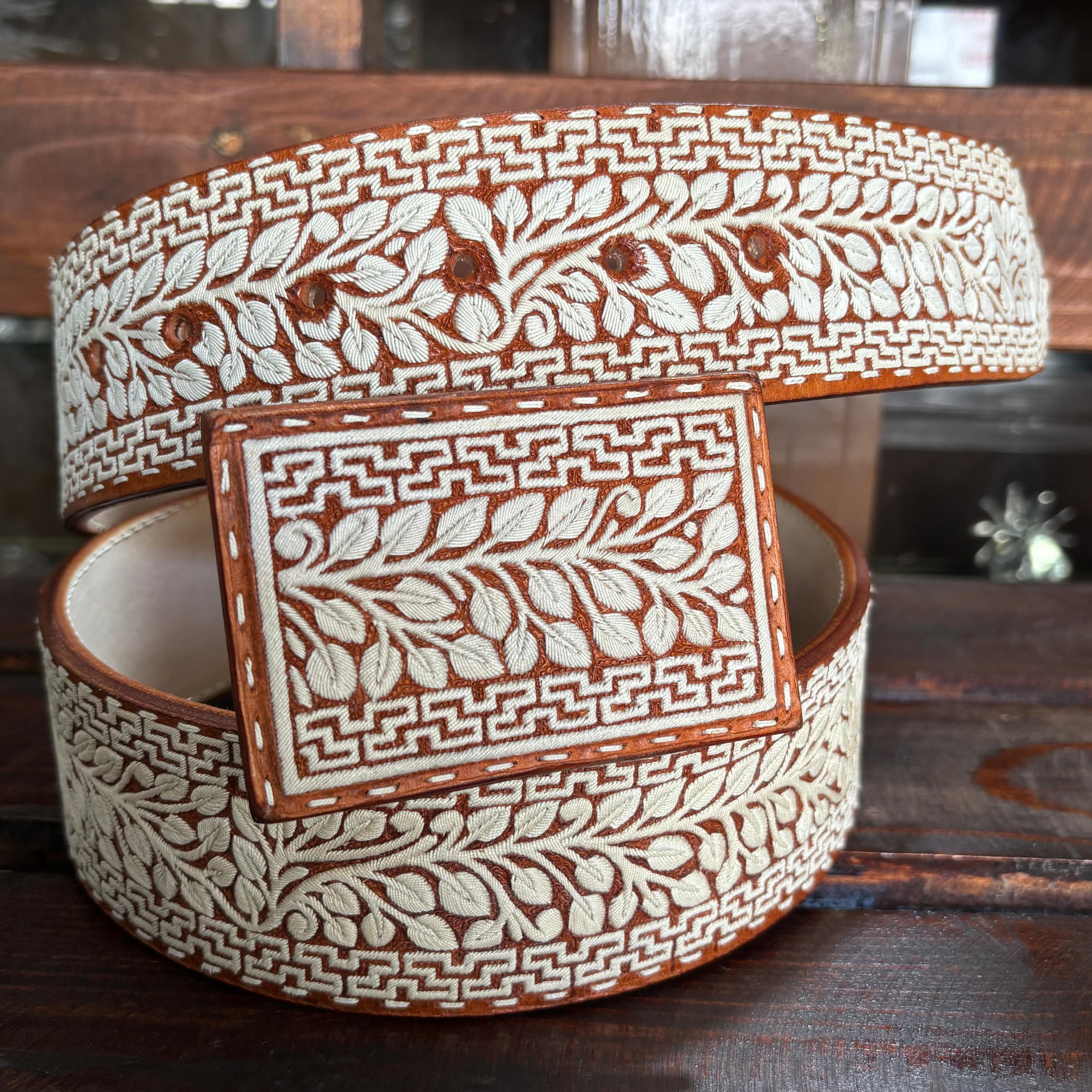 diestros artesanos en el manejo el hilo de pita. Estos cinturones pueden elaborarse también con hilo de plata, dándo a la piel sobre la cual se borda un acabado único.